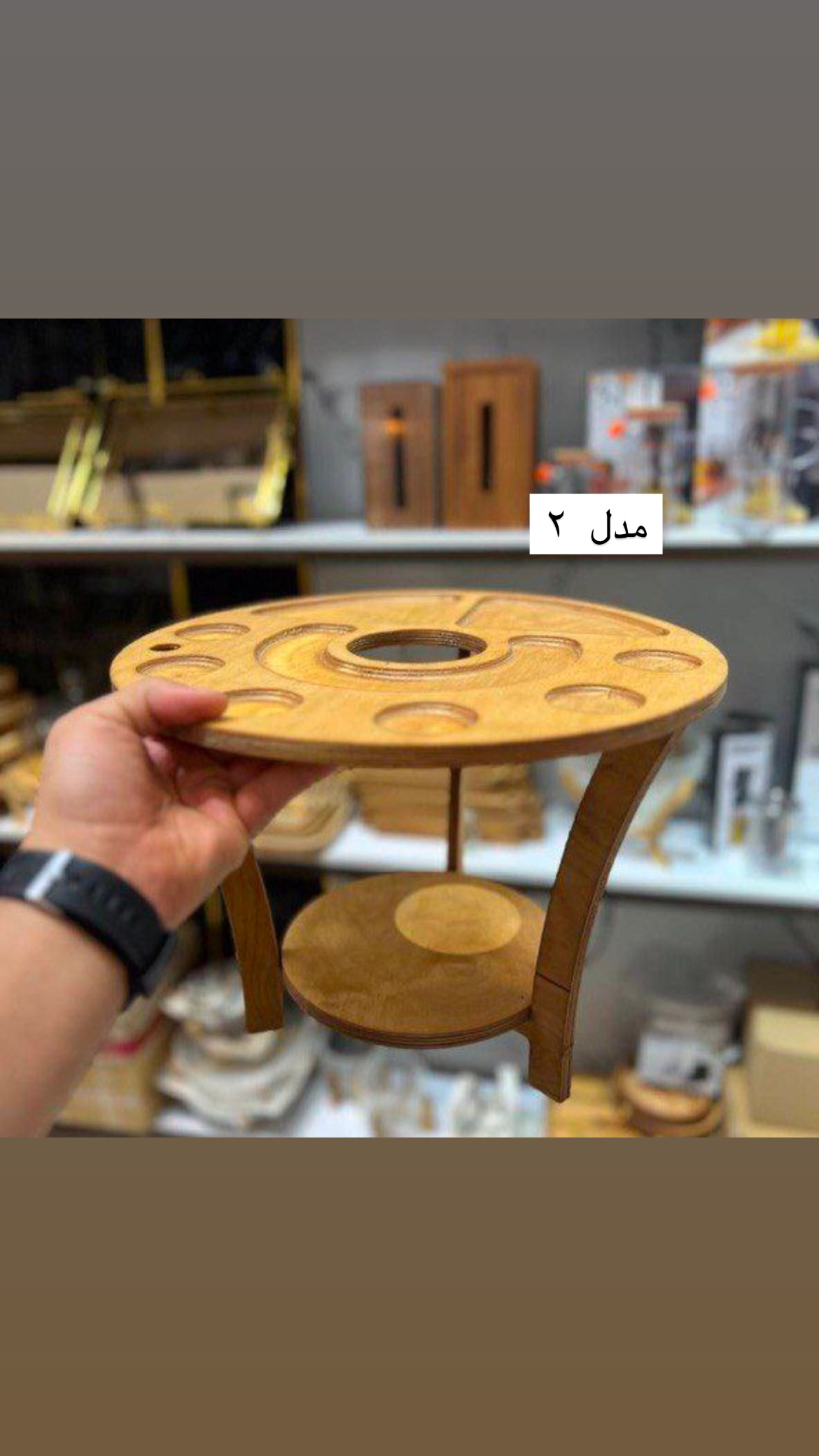 ست شامل یک جفت استند قطر سایز کوچک حدود ۱۶ قطر سایز بزرگ ۲۰ پایه چوب طبیعی جنس سینی فلزی