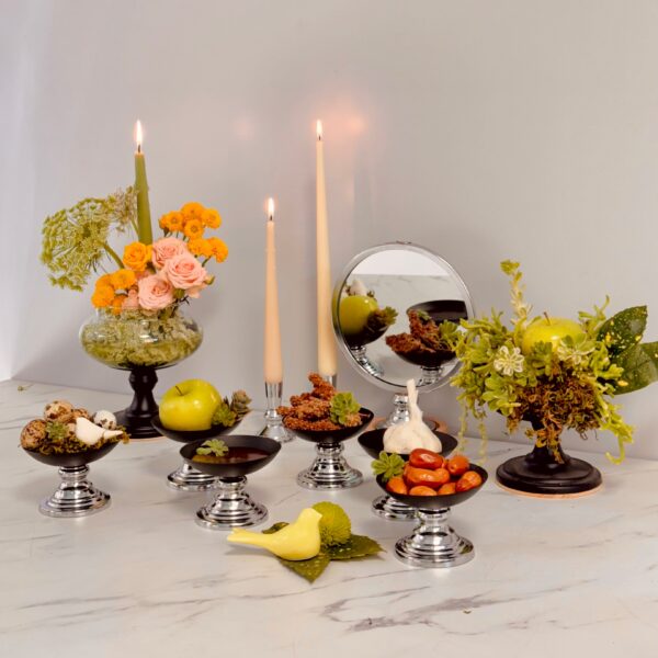 ست شامل ۱۱ عدد ظرف متنوع که شامل یک پایه بهمراه آینه گرد یک عدد ظرف پایه دار ۵ عدد
