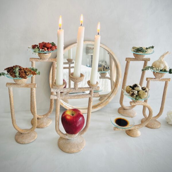 هر ست شامل ۶ عدد جاشمعی پتینه شده یک سینی قطر ۳۰ با رینگ چوبی پتینه شده ۶ عدد نگهدارنده