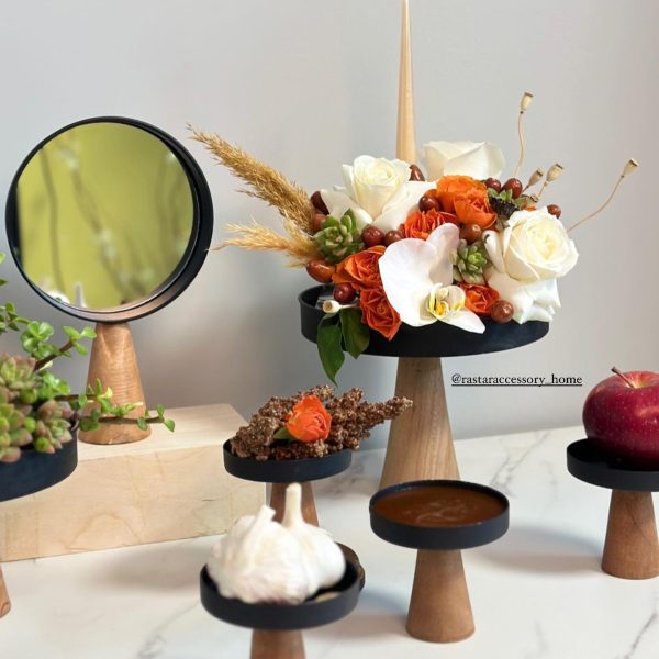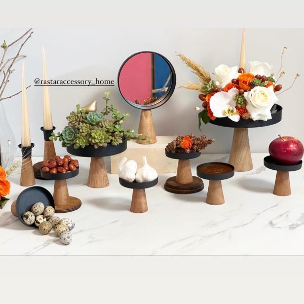 ست شامل یک جفت استند قطر سایز کوچک حدود ۱۶ قطر سایز بزرگ ۲۰ پایه چوب طبیعی جنس سینی فلزی